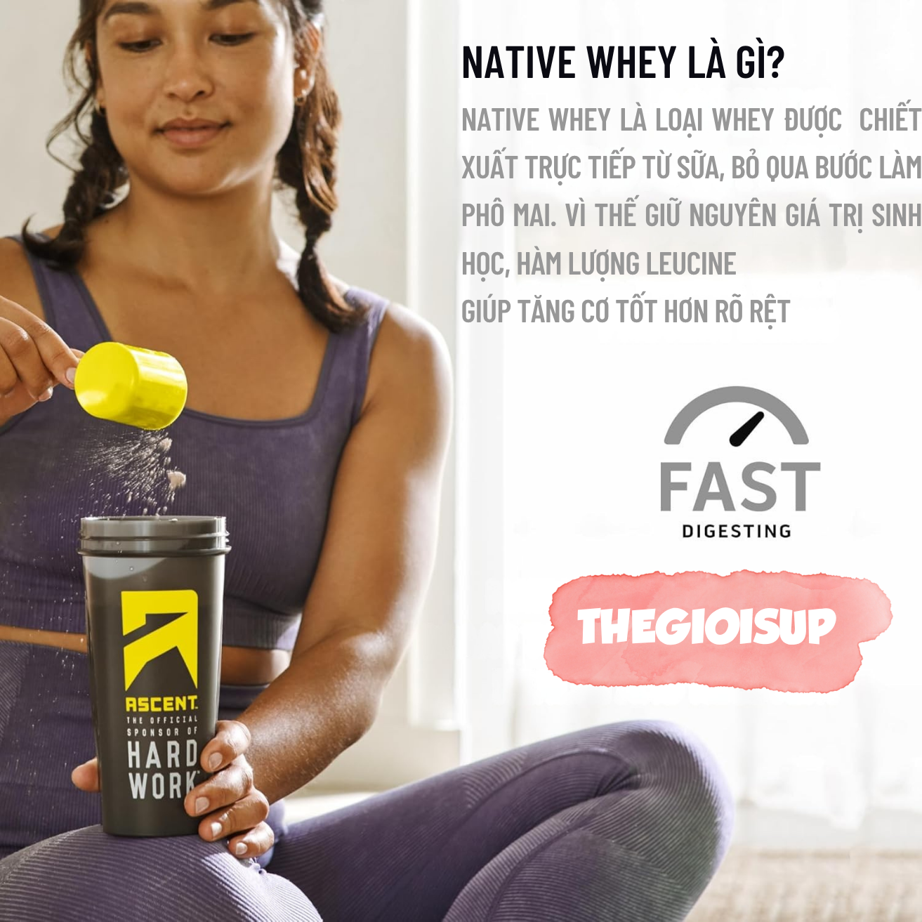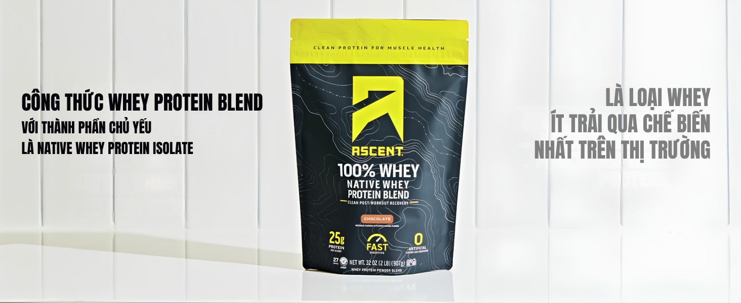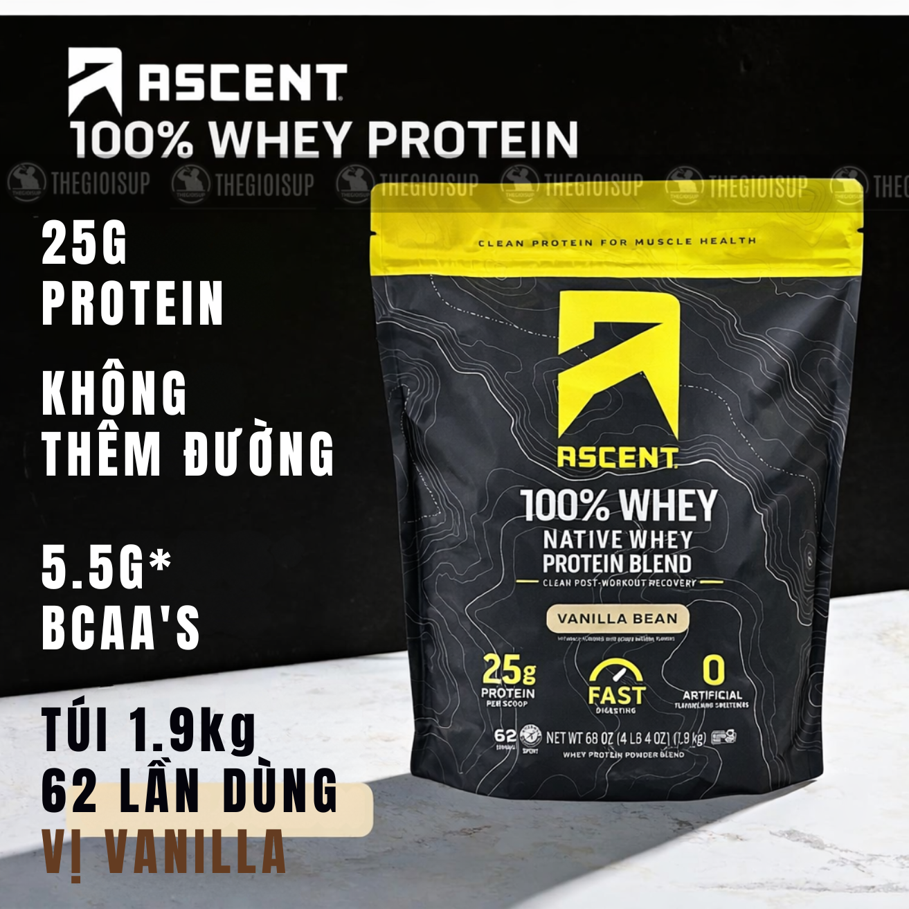 Việc cung cấp năng lượng cho cơ thể để duy trì một lối sống năng động, lành mạnh đòi hỏi sự cam kết lớn. Một yếu tố quan trọng là giảm thiểu thực phẩm chế biến sẵn và thay vào đó nấu những bữa ăn cân bằng dinh dưỡng bằng các nguyên liệu nguyên chất. Nhưng việc tìm kiếm protein sạch, ít chế biến lại khá khó khăn. Giống như nhiều sản phẩm khác tại các cửa hàng tạp hóa thông thường, hầu hết các thanh protein bar và đồ uống protein đóng chai sẵn đều có thêm đường và các thành phần nhân tạo mà bạn không thể phát âm được. Vì chúng tôi tin vào việc ăn uống lành mạnh, nên chúng tôi kiên quyết từ chối những sản phẩm đó . Nhưng có tin tốt cho bạn, đã có Ascent 100% Whey Protein. Ascent 100% Whey chứa hỗn hợp các loại protein whey, bao gồm Native Whey, loại protein whey ít qua chế biến nhất hiện nay. Native Whey là một loại protein chất lượng cao, tinh khiết, được sản xuất với ít công đoạn hơn - đồng thời hỗ trợ quá trình phục hồi cơ bắp mà bạn mong muốn sau khi tập luyện.