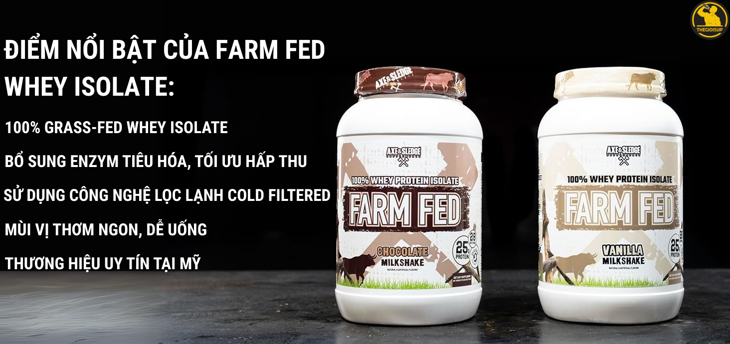 Axe & Sledge Farm Fed là dòng Whey Protein Isolate 100% bò ăn cỏ cao cấp, mang đến 25g protein tinh khiết trong mỗi khẩu phần. Sản phẩm được sản xuất tại Mỹ, áp dụng công nghệ lọc lạnh hiện đại, giúp giữ trọn vẹn axit amin thiết yếu (EAAs) và chuỗi nhánh (BCAAs) hỗ trợ tăng cơ và phục hồi hiệu quả.