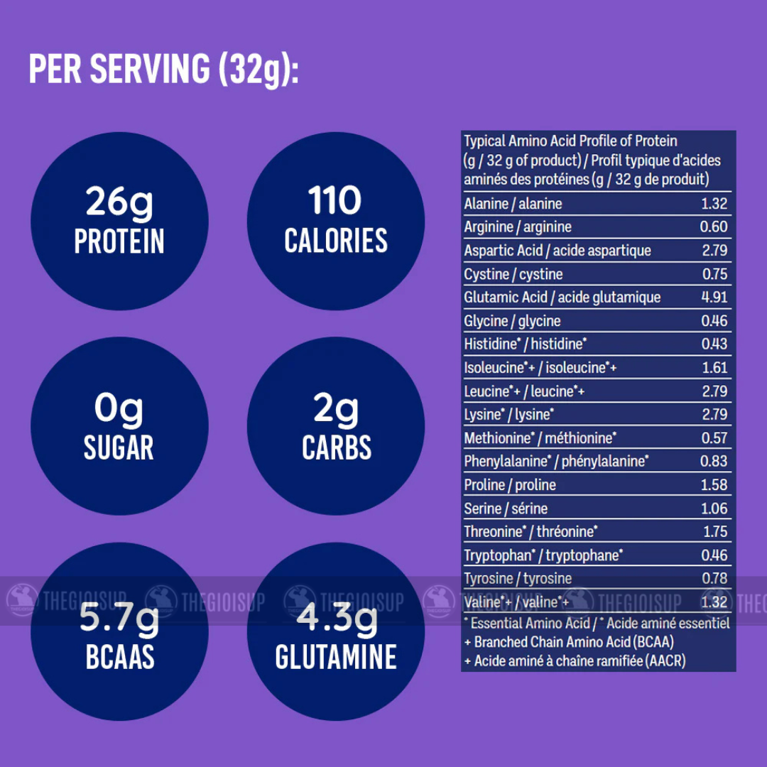 ● 26g protein từ 100% whey isolate siêu lọc, cung cấp lượng protein tối đa trong mỗi muỗng