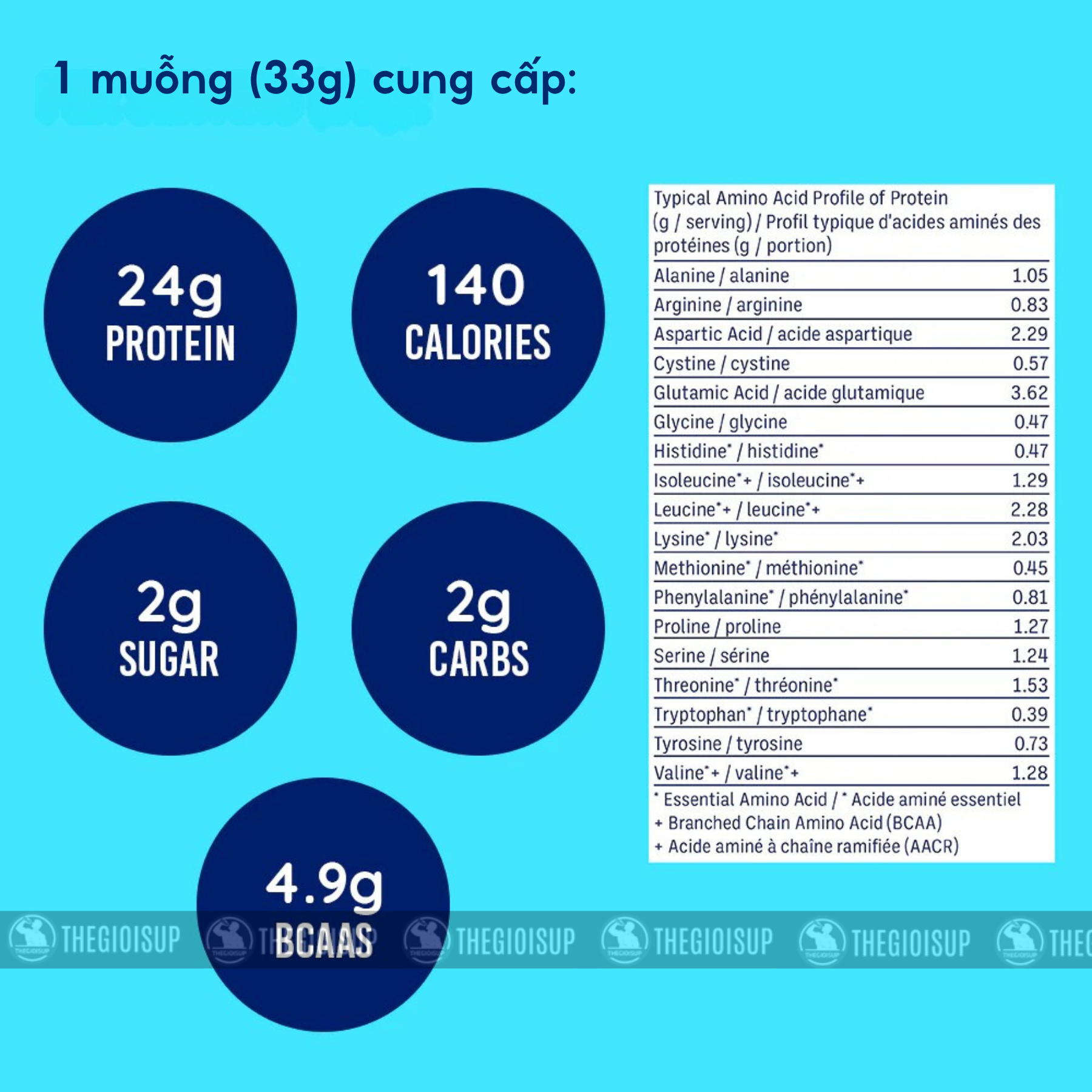 - ~4.9 – 5.3g BCAA hỗ trợ phục hồi cơ